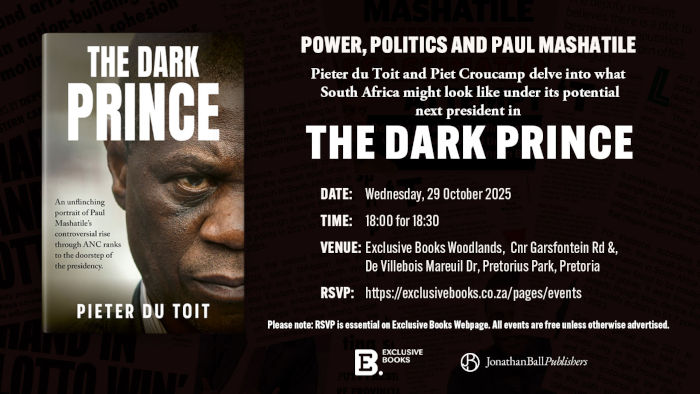Join Jonathan Ball Publishers for the launch of The Dark Prince by Pieter du Toit — a bold and unflinching portrait of Paul Mashatile’s controversial rise to the doorstep of the presidency.