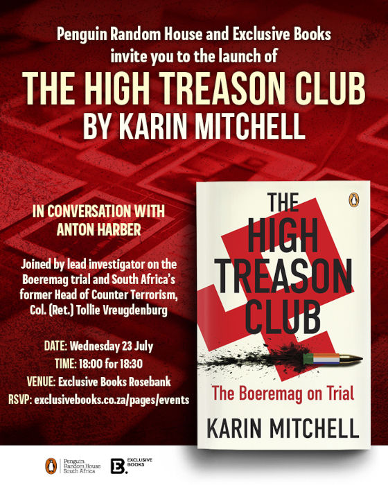 Join Karin Mitchell for the launch of The High Treason Club: The Boeremag on Trial in Joburg (23 Jul)